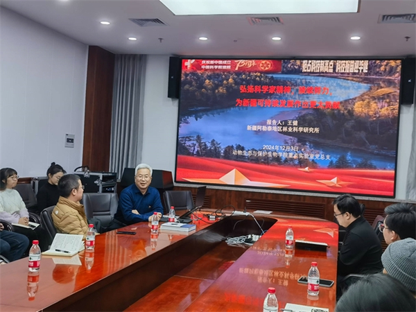 为深入贯彻落实党的二十大精神,全面践行习近平总书记关于弘扬科学家精神的重要指示,积极响应我院“抢占科技制高点 科技报国迎华诞”的要求,推动党建工作促进科研创新,2024年12月3日上午,动物生态与保护生物学院重点实验室党总支于C101会议室成功举办了“党建促生态保护”专题党课。本次党课主题为“弘扬科学家精神,接续努力,为新疆可持续发展作出更大贡献”,邀请新疆阿勒泰地区林业科学研究所教授级高级工程师王健老师主讲,詹祥江副所长等总支部党员、发展对象和入党积极分子参加了本次党课。活动由职工支部副书记刘宣研究员主持。