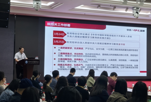 在专题学习环节,赵建国同志作题为“深入贯彻中央八项规定精神学习教育”专题报告,系统阐释了党中央和院党组相关工作部署的核心要义。报告围绕“党中央和院党组关于开展深入贯彻中央八项规定精神学习教育相关工作部署”,“什么是八项规定和八项规定精神”及“开展深入贯彻中央八项规定精神学习教育的重大意义和要求”三部分内容展开,通过解构“八项规定”的政策本源与时代价值,着重强调党员干部应以“学思践悟”为行动指南,在“学、查、改”的闭环管理中锤炼党性修养。报告特别指出,作为国家战略科技力量的重要组成部分,科研院所的党员干部更应率先垂范,将作风建设与科技创新深度融合。