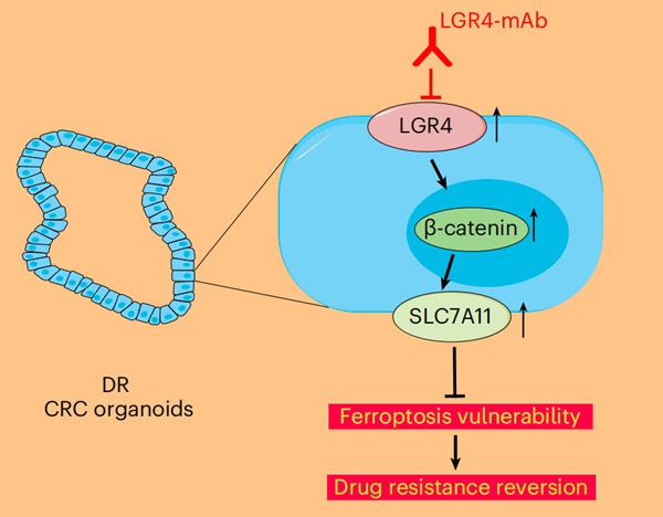 该研究构建了结直肠癌病人来源的肿瘤类器官库,通过对比化疗药敏感和耐药的肿瘤类器官的基因转录组,发现LGR4/Wnt/β-catenin信号通路的高度激活与肿瘤耐药密切相关。研究人员筛选出高度特异的靶向LGR4的单克隆抗体,该抗体能显著抑制肿瘤耐药性。深入的机制分析揭示,该抗体可以抑制Wnt/β-catenin通路的激活,并下调铁死亡抵抗基因SLC7A11的转录。当与化疗药物联合使用时,LGR4的单克隆抗体靶向Wnt/β-catenin信号通路,从而促使结直肠癌细胞发生铁死亡。