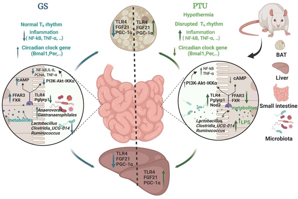 体温调节是一个经典的生理学问题,甲状腺激素在能量代谢和体温调节中发挥着关键作用。目前,因生活环境、饮食、遗传、长期应激等因素导致的甲减(甲状腺功能减退)、甲亢(甲状腺功能亢进)、甲状腺结节等甲状腺疾病的发病率日益升高,严重者发展为甲状腺癌。在现代系统生物学研究中,中国传统医学“药食同源”理论与“肠道微生态”的有机结合,对代谢、消化和免疫功能等方面的潜在作用备受关注,这是人类健康和疾病的一个重要方面。然而,人们对药用植物在体温调节中的机制认识不足。