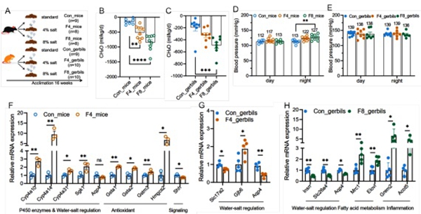 图1 高盐饮食对小鼠和长爪沙鼠自由水清除率、血压以及肾脏基因表达的影响