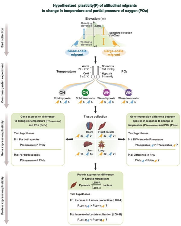 在迁徙过程中,表型可塑性通过多层次的性状调整(生理、形态、行为及分子),使鸟类在垂直迁移中实现精准的海拔适配。但不同迁徙海拔分布域的鸟类,如何应对温度和氧分压各自改变所发生,却未曾可知。从理论上来讲,物种所展现的表型可塑性改变应该与它们各自经历的环境压力成正比,那么,广域海拔分布域的鸟类所经历的氧分压较大,应对与氧分压改变的表型可塑性应该更大,反之,窄域海拔分布域鸟类面对的温度改变较大,它们应对温度改变的表型可塑性则较大。
