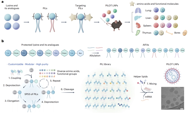 2025年9月1日,韦德怎么下载魏妥研究组联合北京大学未来技术学院程强课题组,在《Nature Materials》杂志上在线发表了题为“Tissue-specific mRNA delivery and prime editing with peptide–ionizable lipid nanoparticles”的研究论文。研究团队将生物学中结构多变的多肽与脂质纳米技术中的可电离脂质这两大类生物材料融合,创造出一种全新的肽基可离子化脂质(Peptide Ionizable Lipid,PIL)材料,开发了名为PILOT(Peptide Ionizable Lipid-driven Organ Targeting)的器官靶向mRNA递送平台(图1)。PILOT平台可在无需配体修饰和额外脂质加入的情况下,实现多器官的特异性mRNA递送,且所发现的PIL靶向修饰策略具有通用性和可预测性。具体来说,1)赖氨酸/精氨酸修饰实现mRNA的肺靶向递送;2)半胱氨酸/组氨酸/酪氨酸/苯丙氨酸修饰实现mRNA的肝靶向递送;3)谷氨酸/天冬氨酸/脯氨酸/色氨酸修饰及Nα-乙酰化赖氨酸/精氨酸修饰实现mRNA的脾脏特异性递送;4)赖氨酸-酪氨酸二肽的加入显著提升mRNA的胸腺靶向递送;5)阿仑膦酸的加入显著提升mRNA的骨骼靶向递送。