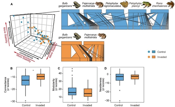 研究发现,入侵牛蛙已导致舟山群岛本土两栖类物种丰富度和种群丰度的显著下降。食性分析结果显示,牛蛙与本土两栖类在节肢动物等主要捕食对象上高度重叠,种间竞争关系明显;同时,在牛蛙捕食的所有脊椎动物猎物中,我国本土两栖类占比最高,体现出明显的捕食偏好性;进一步网络分析显示,牛蛙入侵后取代了本土两栖动物在捕食网络中的中心位置,并促使黑斑侧褶蛙(Pelophylax nigromaculatus)等本土物种的食性泛化,这一过程导致本土两栖类捕食网络的连接度增加、模块化程度降低,并最终导致本土捕食网络稳定性的下降 (图2)。