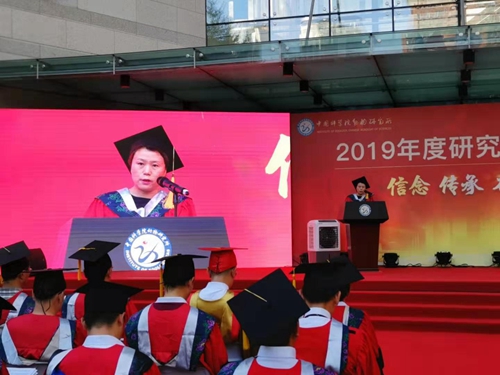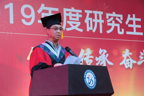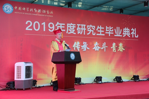 周琪所长首先向圆满完成学业的毕业生们致以最热烈的祝贺,向为他们成长付出辛劳、奉献的导师、亲友,致以崇高的敬意和衷心的感谢。围绕“信念·传承·奋斗·青春”这四个主题词,周所长向即将离开动物所、开始人生新征程的同学们提出了几点期望:首先是要坚定理想和信念,理想信念是人生道路上的指南针,唯有坚守至诚的信念,才能不被纷繁复杂的现象所迷惑、不被各式各样的困难所打倒,把握正确的方向、迎来人生的辉煌;二是要传承优良传统,动物研究所具有九十年的悠久历史,科技报国、爱国奋斗的优良传统在一代代动物所人中传承下来,希望同学们不论走到哪里,都把动物所的这种精神传承下去,在传承中创新,在传承中发展;三是要坚持不懈奋斗,国家要发展、民族要复兴,靠的是一代又一代人的不懈奋斗,希望同学们把使命担当起来,把责任扛在肩上,用奋斗致敬青春,用奋斗致敬祖国;四是要不负青春、不负时代,青年人是科技创新的新生代、主力军,肩负着中华民族伟大复兴的责任和重担,希望每一名同学都能抓住时代机遇、勇做青春追梦人,把自己编织进入这个伟大的时代,创造出属于你们自己、属于母校、属于祖国的成就和辉煌。最后,周所长希望同学们常回母校看看,分享成功的喜悦和骄傲,分享人生的感悟和体会。
