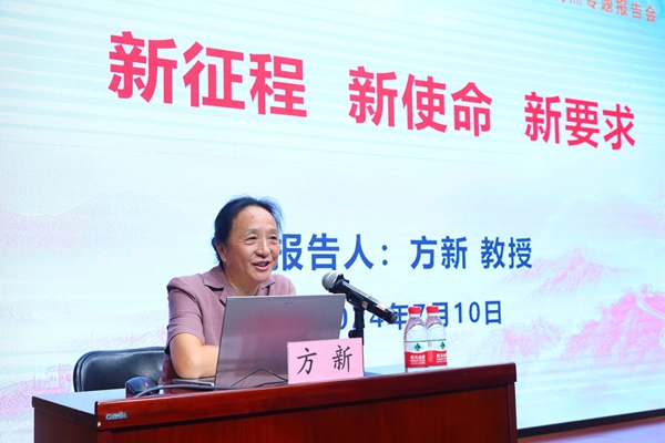 方新以“新征程 新使命 新要求”为题,从中国现代史和世界科技史宏大的历史视野,深刻指出科技是引领人类社会未来发展的主导力量,详细阐明了科技自立自强在现代化强国中的重要战略支撑地位和巨大引领作用。她指出中国正面临着实现中国式现代化的新征程,意味着在现代化进程中要坚持中国特色、中国道路,既要吸收借鉴国外先进经验,又要根据中国国情特点进行创新和发展。从经济、政治、文化到社会诸方面,实现中国式现代化不仅仅是跟随潮流,更是展现国家独特魅力和软实力的重要机遇。方新指出,科技强国是当今世界各国争相追求的目标,我国作为世界第二大经济体,必须承担起建设科技强国的新使命,不断提高技术水平和创新能力,为国家实现经济持续增长和国际竞争力提供强有力支撑。与会人员纷纷表示,专题报告内容广博、逻辑严密、哲理深邃、情怀深厚,引导和启发广大师生更好地理解科技如何推动新质生产力形成与发展、什么是科技制高点、如何打造研究所建制化体系化科研攻关模式,充分发挥国家战略科技力量领头羊作用。